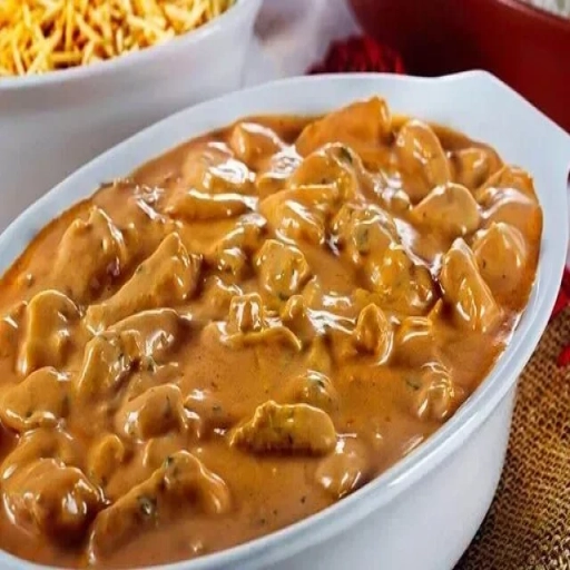 Strogonoff de Frango acompanhada de Arroz, Feijão em caldo ou tropeiro, Macarrão ou Verduras ou Purê ou Farofa de Man... Ver completo